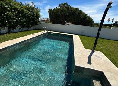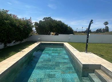 Im Außenbereich befinden sich ein privater Swimmingpool, ein schattiger Essbereich im Freien, ein Grill, ein Chill-out-Bereich und ein Gartenbereich neben dem Pool.