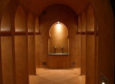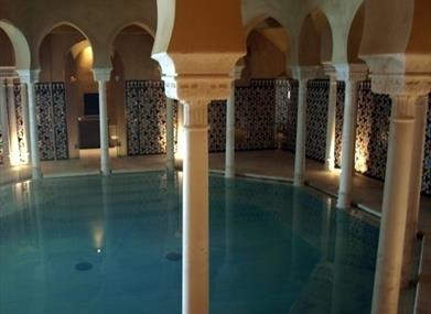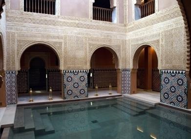 In dem sorgfältig nach den Richtlinien der Nasridentradition dekorierten Hammam Al Andalus (Málaga) bestechen vor allem die Kassettendecken, die Bögen, die Wandmalereien und Mosaiken, die schönen Dachfenster und feinen Gitterwerke sowie das beeindruckende Gewölbe, das auf Arkaden und Säulen gestützt die zentrale Therme krönt.